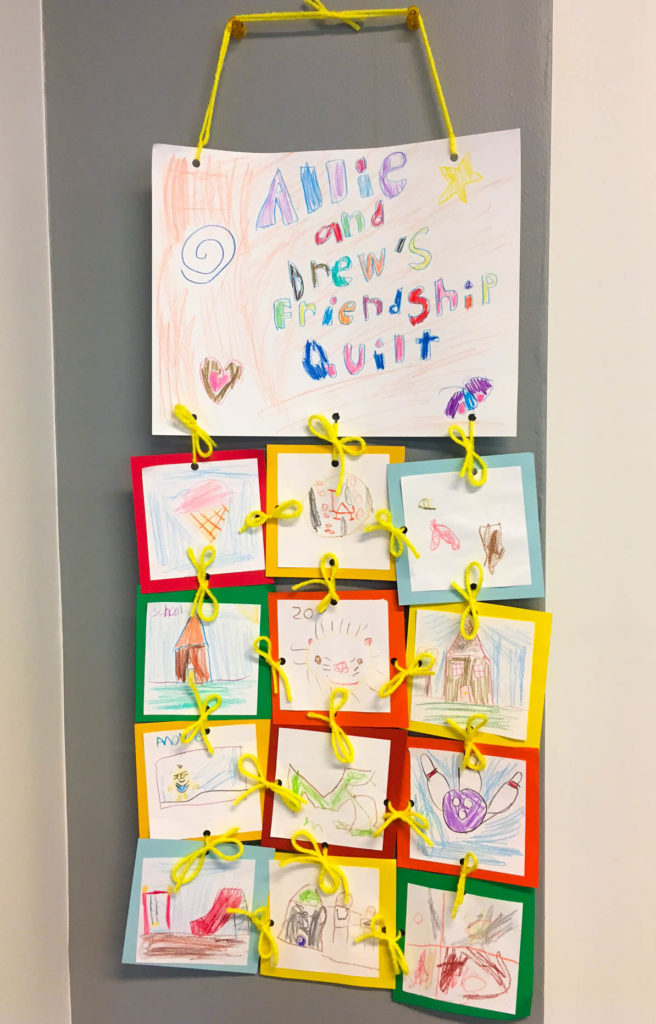 The best part about creating a friendship quilt is the discussion you have following the craft explaining what each quilt square represents. Here is what Allie and Drew came up with when asked, “What are some things you like to do with your friends?” (from top left to bottom right):